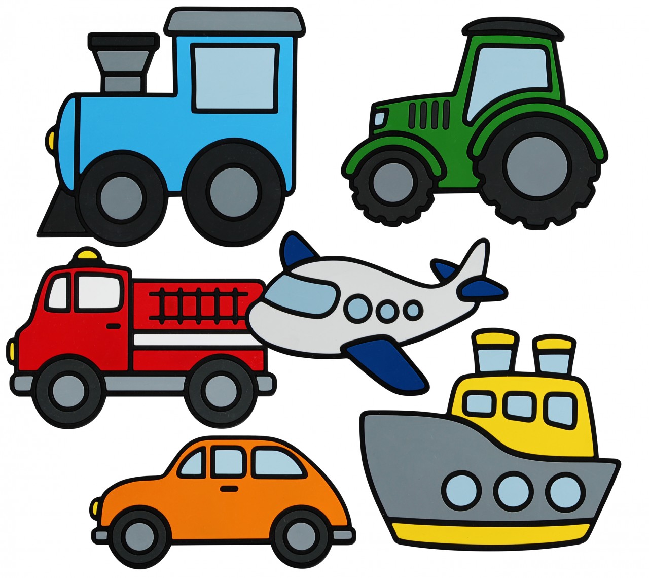 Set of six poly Transportation including a train, tractor, fire truck, airplane, car and boat. Approx 10"